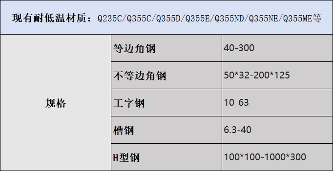信橋國標(biāo)庫存構(gòu)成如下:國標(biāo)型材應(yīng)有盡有,耐低溫、低合金、各種規(guī)格齊全。